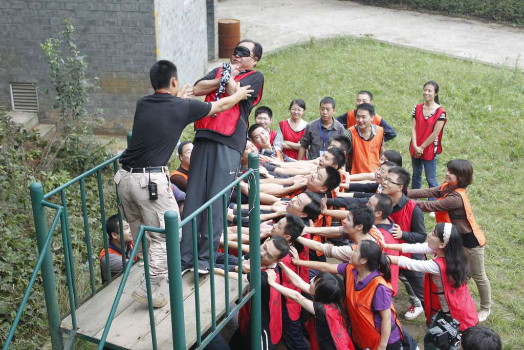 一個具有62年悠久曆史、迄今經久不衰的拓展項目;團隊中的每一個人都有機會站在1.5米高的台面上,身體直立地向後倒下,倒落在下面隊友的懷抱或雙臂中。經過前面兩個科目的熱身已經能夠保證整個活動非常熱烈而完整的完成,打破了團隊成員間的隔膜,增進了同事之間的情感交流。雖然從未敢于背向自己的眼睛,直直的倒下,心裏忐忑不安是難免的,爲了證明自己有克服心裏畏懼的勇氣,與要相信團隊的安全,我還是站在1.5米的高台上,把我的小性命交于了團隊,并嚴格按照培訓師的要求,規範自己的行爲,以免自己的失誤造成隊友的傷害。