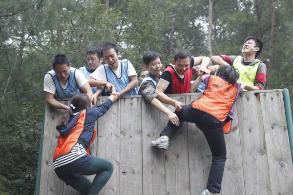 全體成員要在規定的時間内翻越一面4.2米的光滑的牆面,在此過程中,大家不能借助任何外界的工具,包括衣服、皮帶、繩子等。所能用的資源隻有每個人的身體。當培訓師講完這個科目的要點時,我看着這堵4.2米的高牆,心裏困惑這怎麽可能上去呢?豈料,隊伍中已經快速計劃、組織、協調力量,密切合作起來,神速般的達成了默契,兩位隊友很快翻越高牆,并招手迎接新的攀登者。将這看似不可能完成的任務變成了現實,這些高高在上的“純爺們”,戰勝困難的決心和信心,讓我們心生贊美。大家的團結一緻,并沒有落下任何隊員。